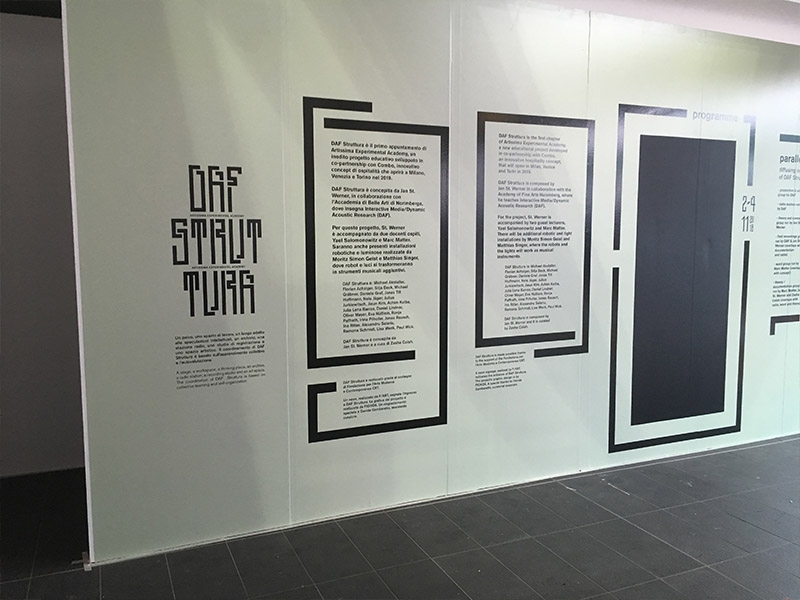 DAF Struttura was composed by Jan St. Werner in collaboration with the Academy of Fine Arts Nuremberg, where he teaches Interactive Media/Dynamic Acoustic Research (DAF). St. Werner was accompanied by two guest lecturers, Yael Solomonowitz and Marc Matter. There were additional robotic and light installations by Moritz Simon Geist and Matthias Singer, where the robots and lights work as musical instruments.