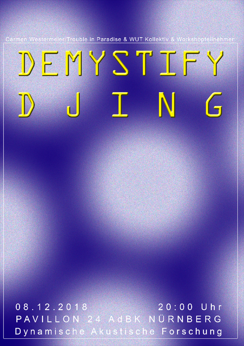 Trouble in Paradise. Neben ihrer Tätigkeit als DJ und Künstlerin, hält sie auch Workshops zum Thema DJing. Bei diesem Workshop bringt sie euch technische Grundlagen näher, zeigt euch verschiedenes Equipment und lässt euch die Basics selbst ausprobieren. Demystify DJing - das ist ihr Motto und so möchte sie in einer angenehmen Atmosphäre die Hemmschwelle senken, auch mal selbst an den Reglern zu drehen. Especially for women* and LGBTIQ* people!